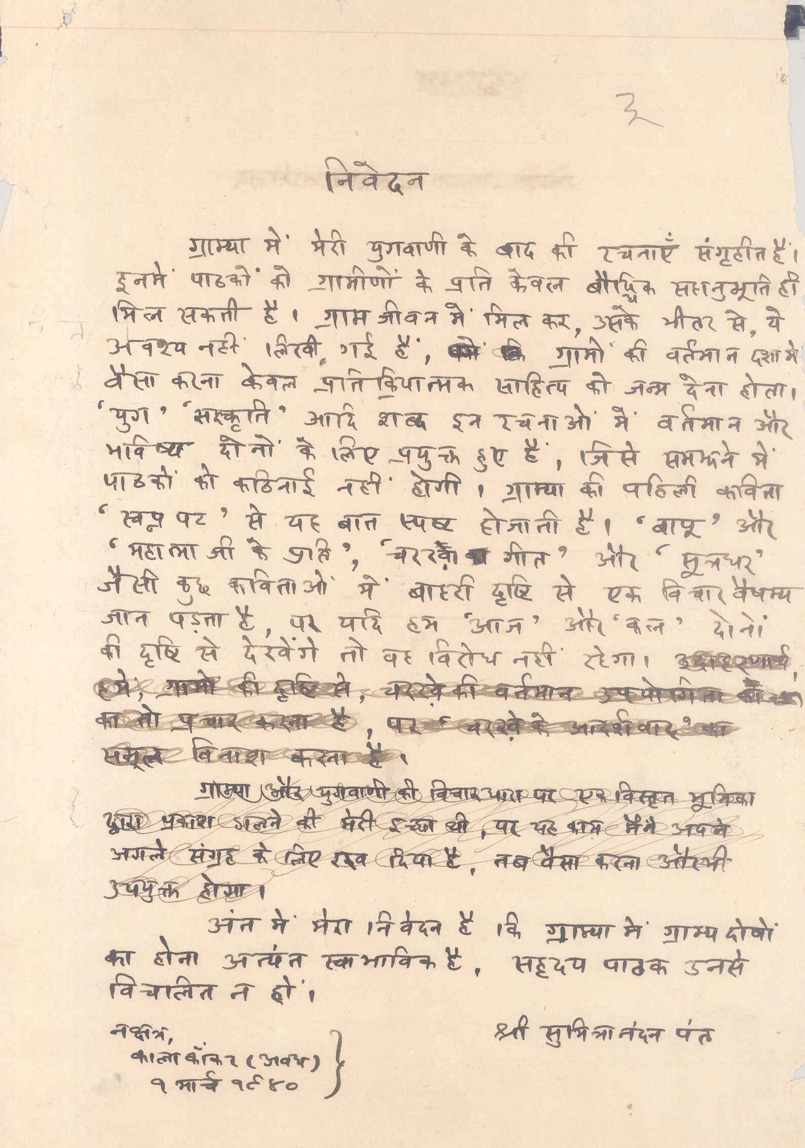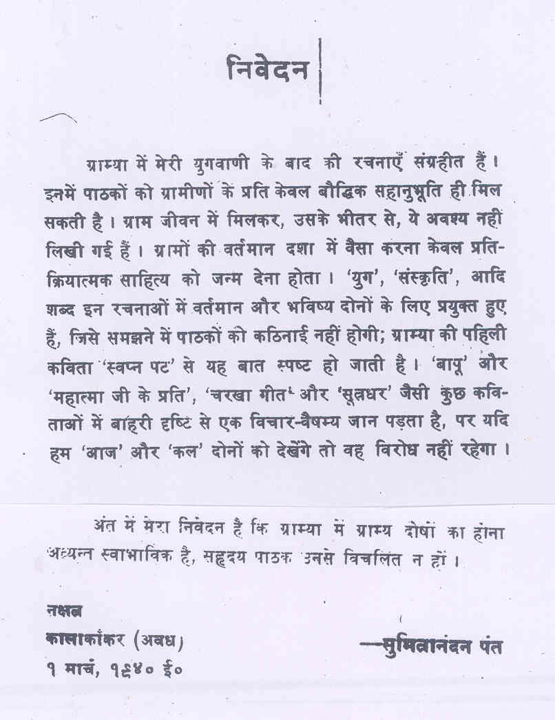 में ग्राम्या संग्रह तैयार करने के बाद पंत ने निवेदन शीर्षक से उसकी